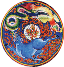 Màu xanh da trời là màu của hư không. Vì tham sân si tuy là gốc luân hồi, là tạo hóa an bài vũ trụ, nhưng thật thể nó hy vọng. Chỉ cần tỉnh giác là nó tan ngay. Ba con thú nối đuôi nhau hàm ý ba độc mật thiết dính liền nhau. Vì si mới tham. Tham bị chướng ngại liền sân. Ba con vật này không ngừng hoạt động trong tâm của phàm phu.