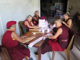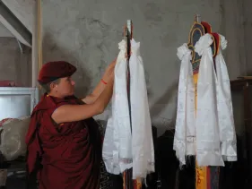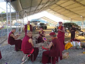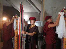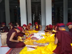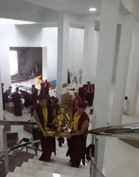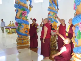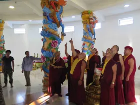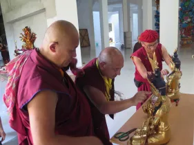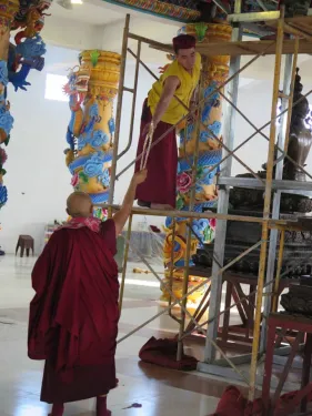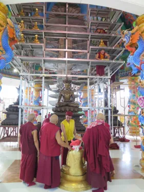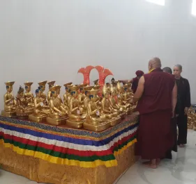 Trong những ngày qua, chư Tăng Ni đã thực hiện yểm 108 tôn tượng chư Phật, chư Thượng sư trên Cây Phúc Điền Quy Y Truyền thừa Drukpa. Sau đó, các tôn tượng này được đặt trên cấu trúc thô của Cây Quy Y để chuẩn bị cho buổi lễ Khai quang điểm nhãn, cung thỉnh Phật an trụ chư tôn tượng trong lòng Đại Bảo Tháp do Đức Pháp Vương Gyalwang Drukpa chủ trì sẽ diễn ra ngày Chủ nhật (27/09).