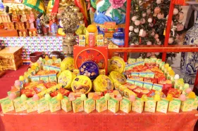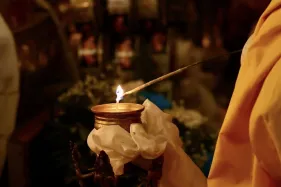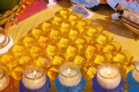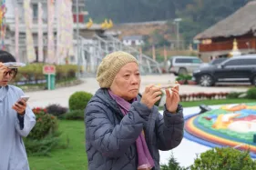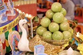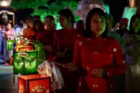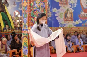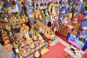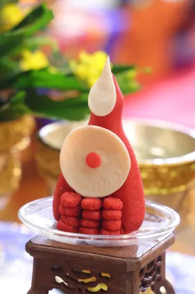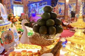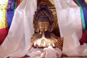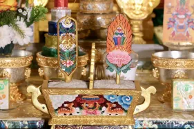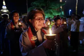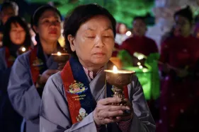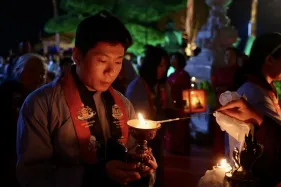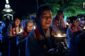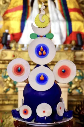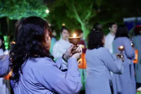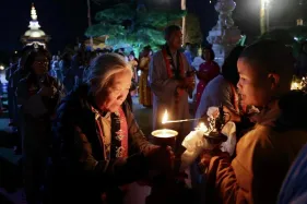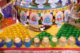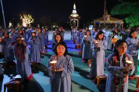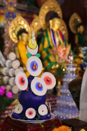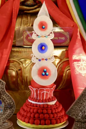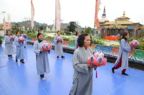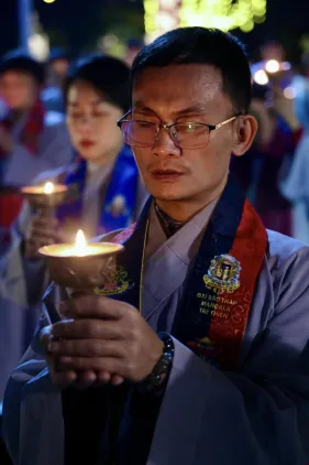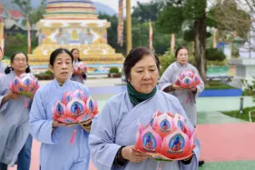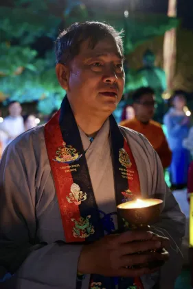 Đại chúng trang nghiêm vi nhiễu Bảo Tháp\, nâng niu ngọn đèn bơ và đặt vào nhà cúng dường đèn, cầu nguyện cho trí tuệ và lòng từ bi luôn tỏa sáng muôn nơi và trường tồn mãi mãi