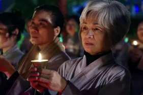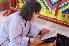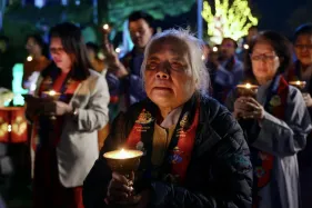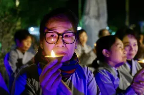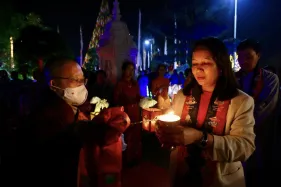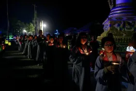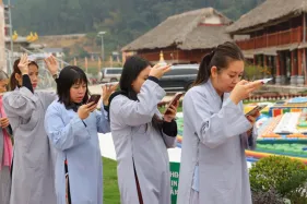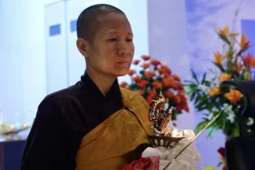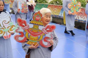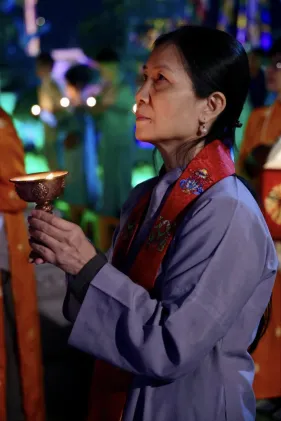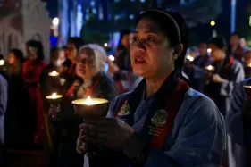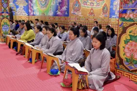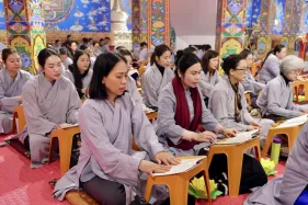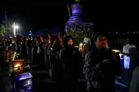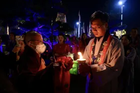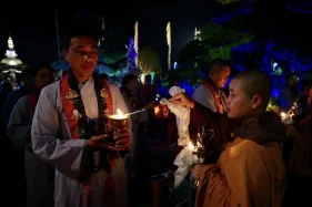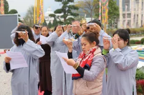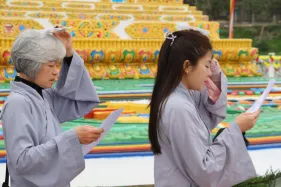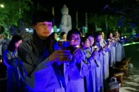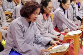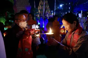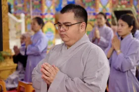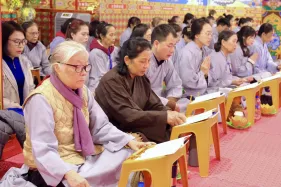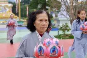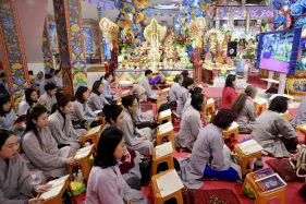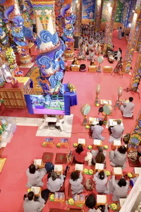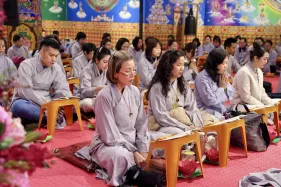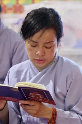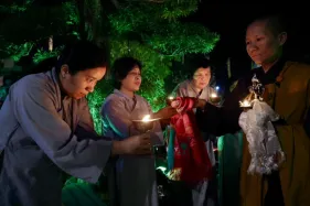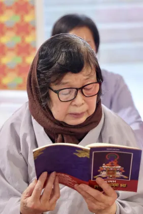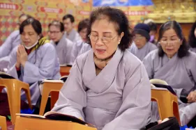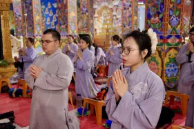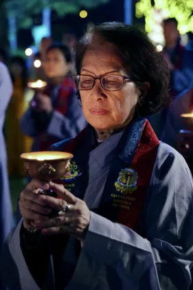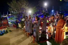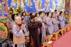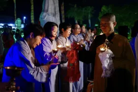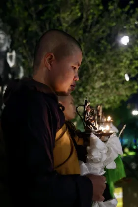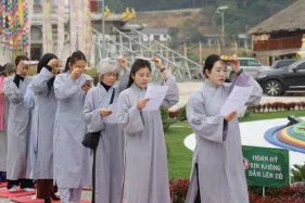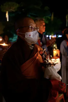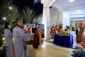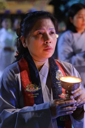 Dưới sự hướng đạo của chư Ni, đại chúng nhất tâm tụng kinh thi kệ về cuộc đời Đức Phật Thích Ca và đỉnh lễ dù trời đã tối. Trong không gian linh thiêng, từng lời kinh vang vọng, kết nối tâm thành của mỗi hành giả với đại nguyện giác ngộ của Đức Thế Tôn.