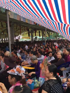 Mới 7h30 sáng, các Phật tử đã trật tự ngồi kín khu hành lễ, hàng trăm người thành kính, chính niệm đi nhiễu trong lòng Đại Bảo Tháp trong tiếng cầu nguyện tha thiết lên Đức Phật A Di Đà. Dưới sự gia hộ của chư Phật và tâm hiếu thuận của những người con Phật cảm ứng đến trời đất, trời nắng nóng, oi bức chỉ trong chốc lát rồi sau đó chuyển sang râm mát. Những luồng gió mát dịu, mưa gia trì rơi nhẹ hòa cùng lời trì tụng chân ngôn Đức Phật A Di Đà giúp tần sóng rung động của chư hương linh được thăng hoa, hòa nhập với năng lượng gia trì thanh cao, thoát tục của chư Phật và Bồ tát mười phương.