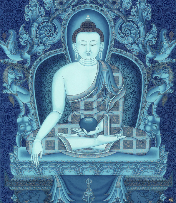 Nhiều năm trước, ở xứ Ấn, có một học giả vĩ đại tên là “Suối Nguồn Giáo Lý”, ông đã sống và giảng dạy tại viện đại học Phật giáo Nalanda. Nhờ thực hành các Nghi quỹ về Bản tôn của mình mà ông đã đạt được một số thành tựu và phô diễn thần thông. Trong lễ quán đỉnh, ông có thể đặt những chiếc bình quán đỉnh ở trên bầu trời để ông có thể dùng hai tay của mình bắt ấn. Tuy vậy, các bậc Thầy đã khuyên ông không nên rời khỏi Nalanda cho tới khi thực sự chứng ngộ được tự tính tâm của mình.
