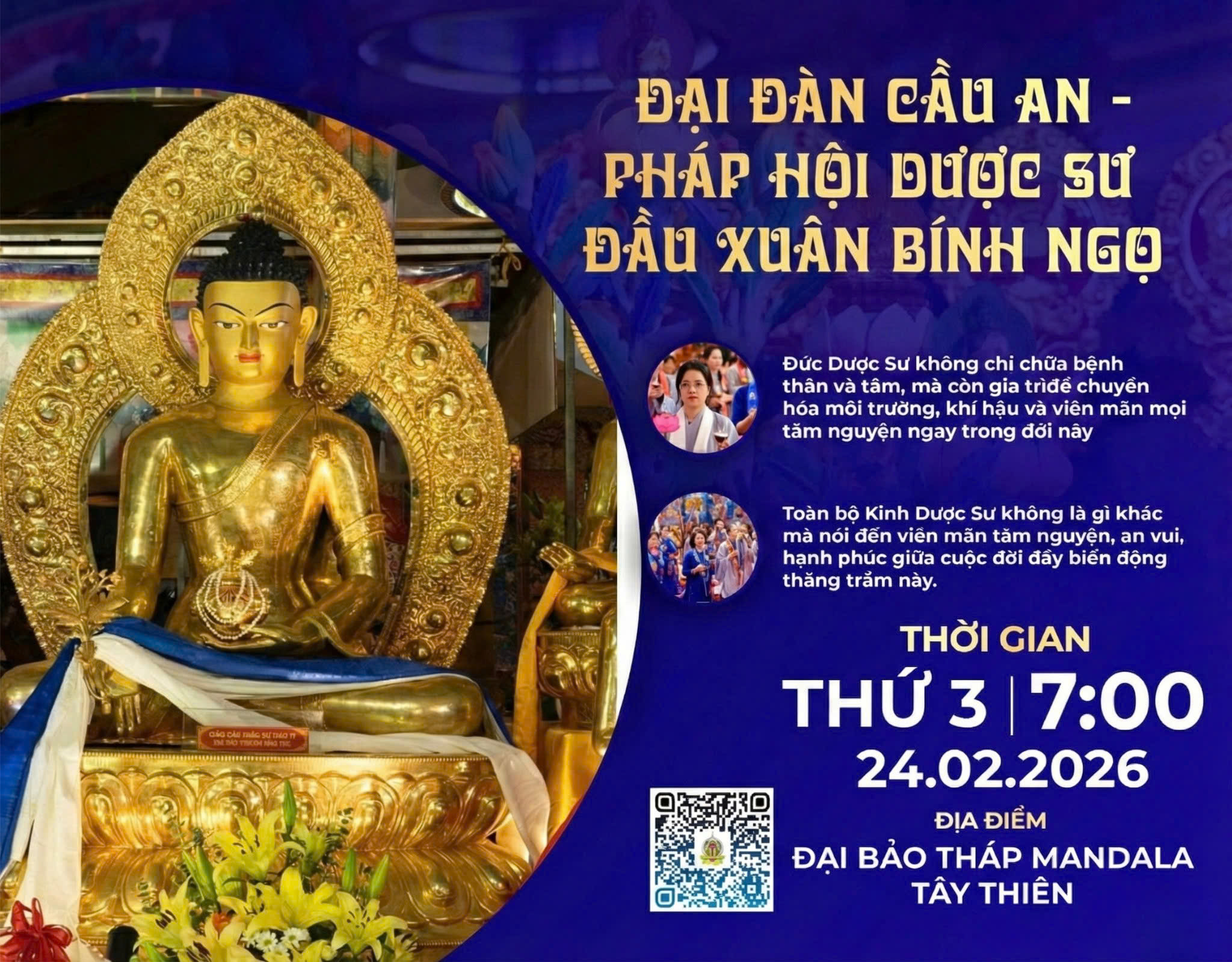 | Sáng hôm nay, tại Đại Bảo Tháp Mandala Tây Thiên, Đức Pháp Vương Gyalwang Drukpa chủ trì Đại lễ An Vị Xá Lợi Phật. Đích thân Ngài an vị Xá Lợi Phật và tôn tượng Phật hơn 1000 năm tuổi lên tầng thứ 7 của phần 13 vòng ở phía trên mắt Phật. Khi Đức Pháp Vương chuẩn bị an vị các Pháp bảo, tiếng sấm đã vang lên cùng với mưa hoa cát tường. Vào buổi chiều, Đức Pháp Vương Gyalwang Drukpa cùng chư Tăng Ni đã cử hành khóa lễ cúng dàng Kim Cương Hộ Pháp để khiển trừ chướng ngại, cùng với đó là vũ điệu Kim Cương Hộ Pháp bởi chư Tăng để tịnh hóa môi trường và ban gia trì cho đàn tràng cùng các Phật tử có mặt. (ảnh: Drukpa Việt Nam và VNExpress) | This morning, His Holiness the Gyalwang Drukpa presided over the grand ceremony for the final consecration the Tay Thien Grand Mandala Stupa. His Holiness personally placed the Buddha's relics and an ancient Buddha statue (dated over 1000 years ago) into a shrine in the 7th ring of the squire, and taught that from now on the Stupa will have the complete blessings of the Buddhas and will spread it to the rest of Viet Nam. When His Holiness was about to place the precious treasures into the shrine, a series of thunder could be heard across the sky, followed by flower rain. The afternoon program included masked dance and a prayer to ward off obstacles. |