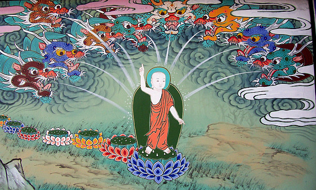 Bỗng, Đại Bồ tát vùng đứng dậy, đi về hướng Đông bảy bước, dưới đất trồi lên bảy hoa sen đỡ bước chân ngài, có hai vị thiên bưng năm món triều phục của Chuyển luân Thánh vương đi hầu hai bên. Đại Bồ tát một tay chỉ thượng, một tay chỉ hạ, nói lên câu kệ: