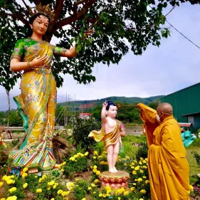 Thái tử Tất Đạt Đa vừa chào đời đã hướng ánh mắt từ bi nhìn khắp bốn phương. Ngài an nhiên tự tại bước bảy bước chân theo mỗi hướng, tượng trưng cho bốn công hạnh Từ, Bi, Hỷ Xả. Mỗi bước chân của Thái tử đều hóa hiện một đóa sen bừng nở, Ngài vừa đi vừa nói rằng: “Thiên thượng, thiên hạ, duy ngã độc tôn”. Đó là pháp ngữ bất diệt từ kim khẩu của Đức Thế Tôn trong giờ phút thiêng liêng của ngày khánh đản. Bởi chúng sinh đắm chìm trong vũng lầy của vô minh tăm tối, ai nấy suốt đời chỉ khư khư chấp ngã, toan tính, lo lắng cho cái tôi mà chưa từng để ý xem “tôi” thật là ai, “tôi” ở đâu, ngu si mê muội nhận vọng làm chân, nhận lầm chút đất nước gió lửa hư vọng làm thân ta, chấp bóng ảnh sáu trần triền miên sinh diệt là tâm ta, quên hẳn chân tính độc nhất tôn quý của chính mình. Chúng ta mải mê với trò chơi bỏ hình bắt bóng dại khờ của con trẻ, nhưng ngày nay may mắn gặp lại cha lành, như chàng Cùng Tử trong kinh Pháp Hoa:
