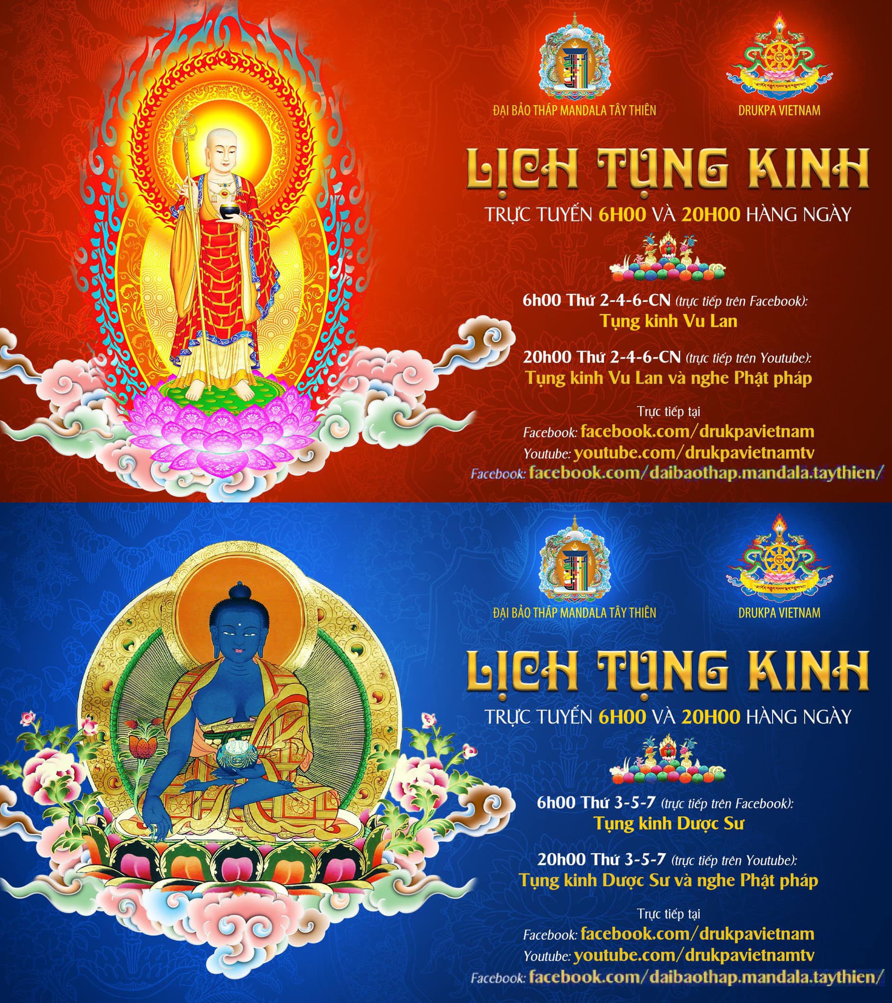 Để duy trì sự tu học Phật pháp, cầu nguyện cuộc sống bình an, đại dịch covid 19 sớm qua mau, Kính thỉnh Quý Phật tử cùng tham gia lễ Phật và tụng kinh hàng ngày, được phát trực tiếp trên (1) kênh Facebook của Đại Bảo Tháp Mandala Tây Thiên và (2) kênh Youtube Drukpa Vietnam TV