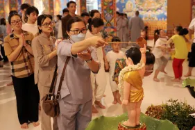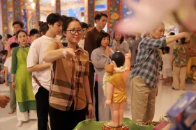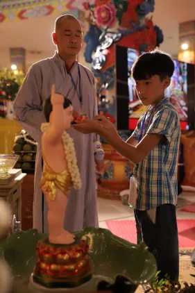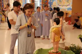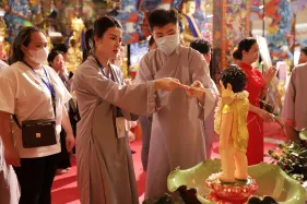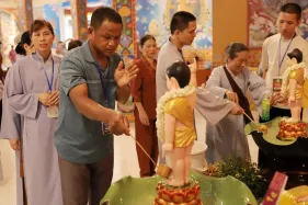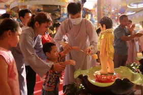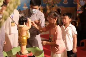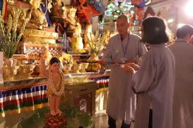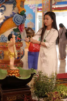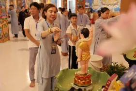 Trong lễ Phật đản, Nghi lễ tắm Phật bao giờ cũng là phần kéo dài nhất. Đã là Phật tử khi tham dự lễ Phật đản ai cũng đều không muốn bỏ qua thiện duyên được dâng nước tắm Phật. Năng lượng của tâm trong lúc chúng ta không tham lam, giận dữ, ganh ghét, ngã mạn… cộng hưởng với sự gia trì của hàng ngàn lời phát nguyện thành Phật tạo thành một năng lực to lớn khiến nước tắm Phật trở thành nước linh thiêng gội rửa những nhiễm ô của phiền não, tà kiến trong tâm và đánh thức đức Phật trong mỗi người.