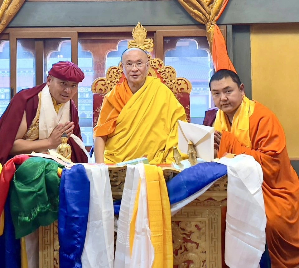 Đức giáo chủ Je Khenpo đời thứ 70 của Vương quốc Bhutan cùng Đức Nhiếp Chính Vương Thuksey Rinpoche (bên trái) và Đức Nhiếp Chính Vương Gyalwa Dokhampa (bên phải) tại Đại Lễ Cầu nguyện Hòa bình Thế giới 2025 tại Thimphu, Bhutan. Ảnh: Drukpa