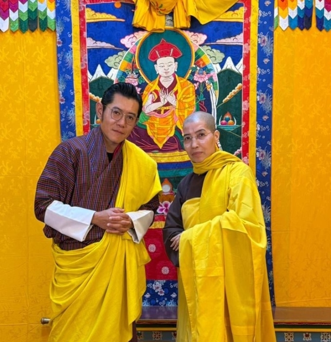 Quốc vương Bhutan cùng Ni sư trụ trì Đại Bảo tháp Mandala Tây Thiên tại Đại lễ Cầu nguyện Hòa bình thế giới 2025 ở Bhutan. Ảnh: Nhân vật cung cấp