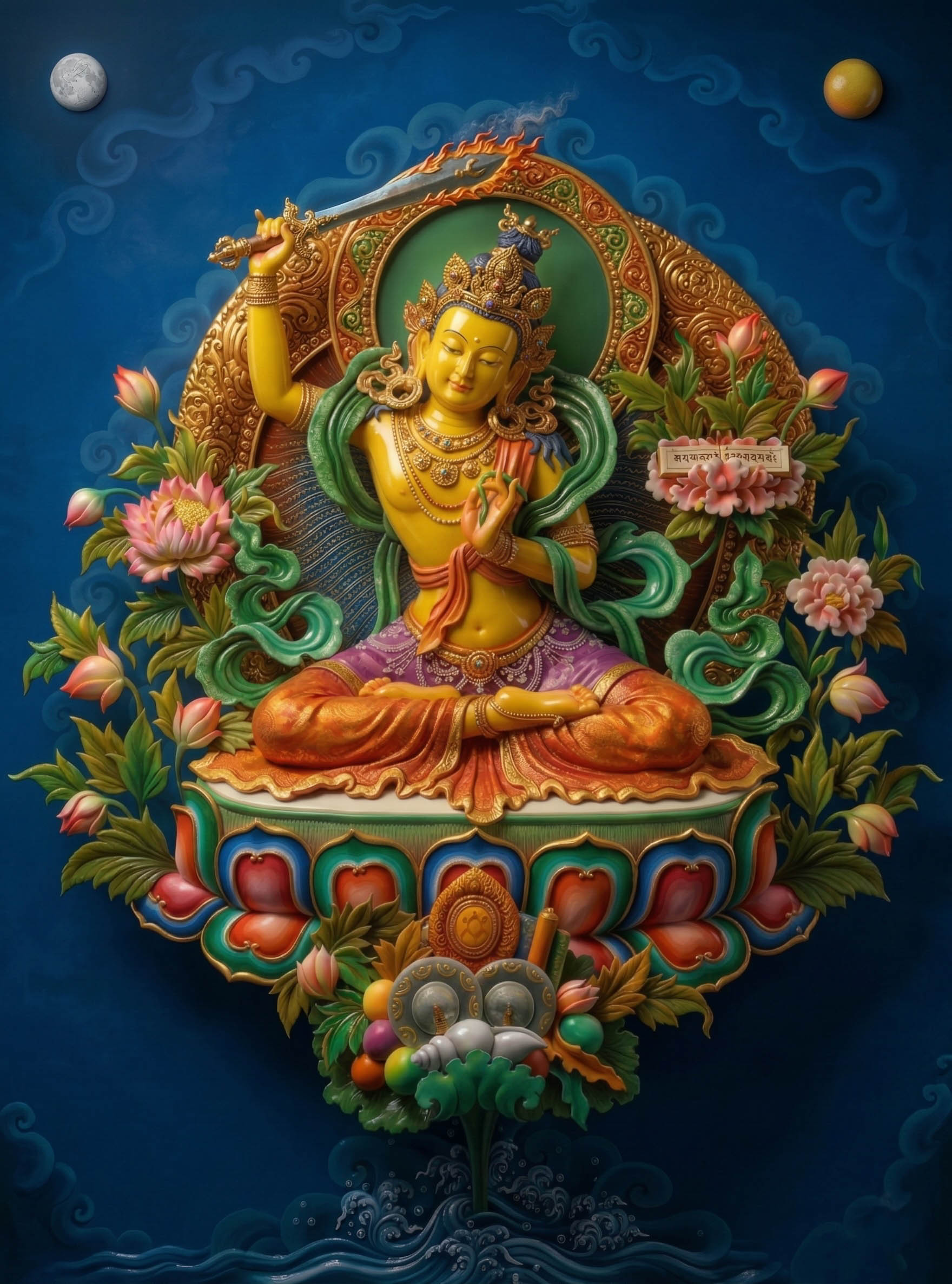 1. Ý nghĩa: Văn Thù Sư Lợi là Bản Tôn Trí Tuệ tối thượng trong Kim Cương Thừa, biểu tượng cho trí tuệ sắc bén cắt đứt vô minh, khai mở tiềm năng trí óc và sự nghiệp.
