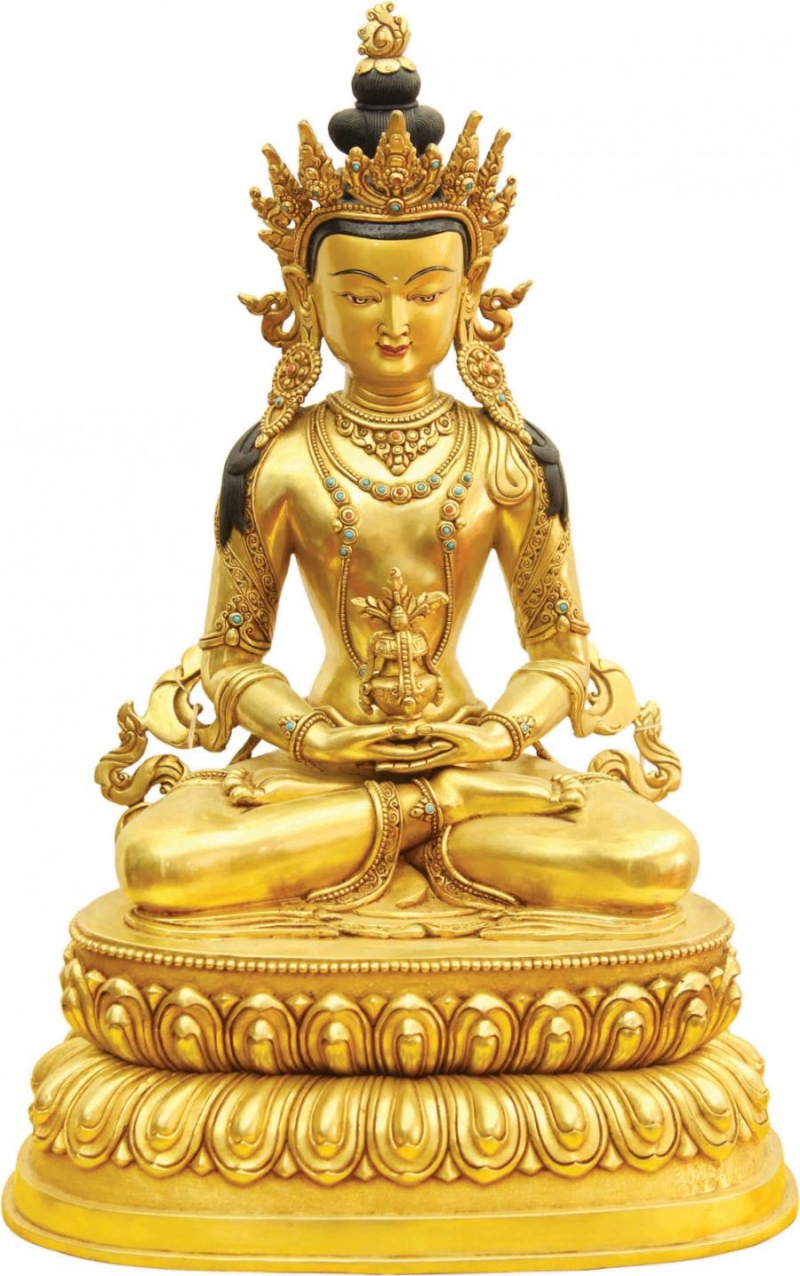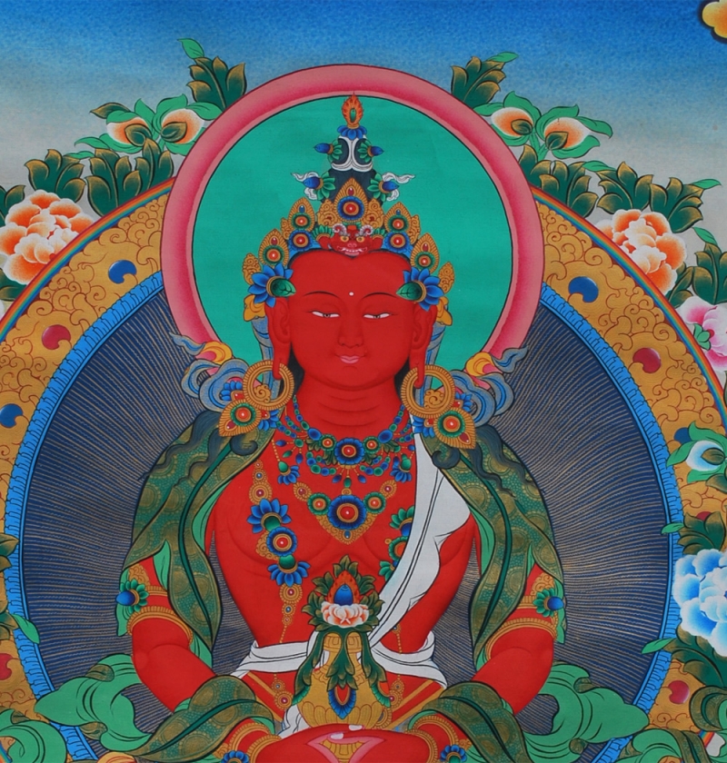 Đức Phật Vô Lượng Thọ trí tuệ thù thắng, một mặt, hai tay trong tư thế kết ấn thiền định. Trên lòng hai tay có bảo bình tràn đầy cam lồ bất tử. Thân Ngài sắc đỏ nêu biểu Đại hỷ lạc. Ngài có ba mươi hai tướng tốt và tám mươi vẻ đẹp, trang hoàng bằng thiên y, tua lụa, bảo báu rực rỡ trong hình tướng Báo thân Phật.