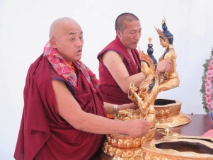 Trong những ngày qua, chư Tăng Ni đã thực hiện yểm 108 tôn tượng chư Phật, chư Thượng sư trên Cây Phúc Điền Quy Y Truyền thừa Drukpa. Sau đó, các tôn tượng này được đặt trên cấu trúc thô của Cây Quy Y để chuẩn bị cho buổi lễ Khai quang điểm nhãn, cung thỉnh Phật an trụ chư tôn tượng trong lòng Đại Bảo Tháp do Đức Pháp Vương Gyalwang Drukpa chủ trì sẽ diễn ra ngày Chủ nhật (27/09).