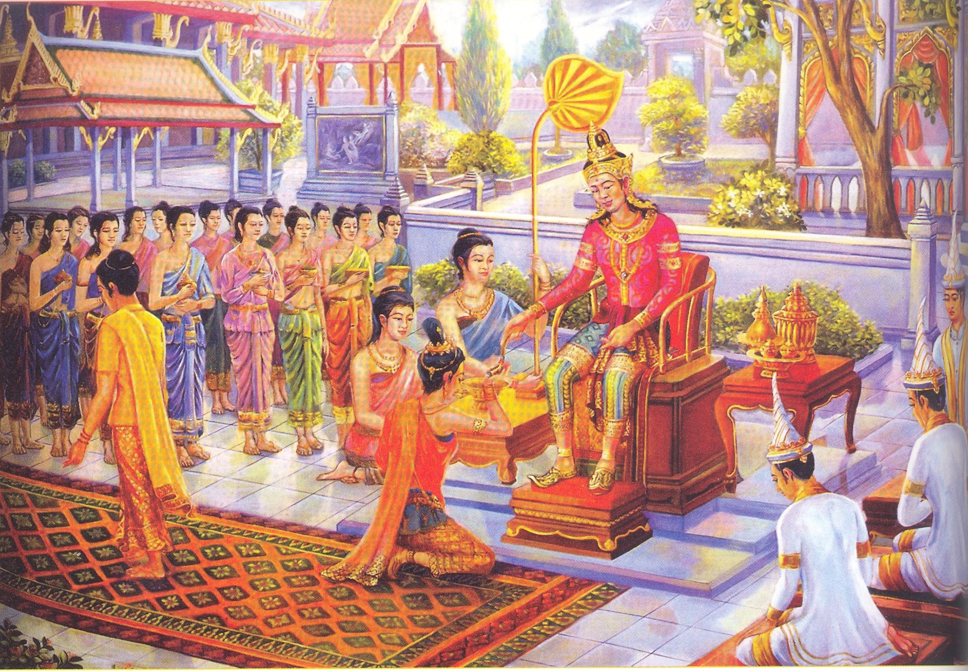 Lúc đó, sống trong cung điện tráng lệ với hàng ngàn cung phi mỹ nữ, thái tử Tất Đạt Đa đáp ứng mọi mong chờ của mọi người ở một vương tử mẫu mực. Ngài chăm lo cho công chúa Da Du Đà La, chính thê của Ngài, cùng tất cả phi tử của mình với tình yêu thương, lòng từ ái bình đẳng, vô phân biệt. Mặc dù không nhìn thấy bất kỳ cảnh khổ sở, đau đớn nào, xung quanh Thái tử chỉ có những cảnh sắc vui tươi, cao lương mỹ vị, nhã nhạc du dương, hoa viên thơm ngát và Ngài được xưng tán, chúc tụng với những ngôn từ cung kính, êm ái của các phi tử, quần thần, Thái tử Tất Đạt Đa vẫn bền bỉ nuôi dưỡng ước nguyện duy nhất vốn sẵn có trong mình là được từ bỏ cuộc sống hoàng gia để hoàn thành một điều gì đó thực sự ý nghĩa vì lợi ích hết thảy chúng sinh.