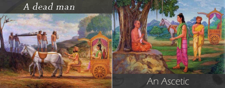 Sau khi chứng kiến bốn cảnh tượng khác nhau, Thái tử Tất Đạt Đa hỏi những người hầu cận rằng có bao nhiêu người trong vương quốc phải chịu đau khổ như vậy. Họ thưa rằng không ai có thể tránh khỏi cảnh sinh già bệnh chết. Song họ cũng không biết đến một vị tu sỹ nào trong vương quốc có thể hoàn toàn từ bỏ mọi mục đích vị kỷ để phục vụ lợi ích tha nhân.