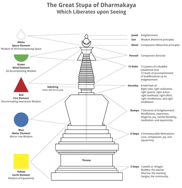 Chính vì vậy khi một Bảo tháp được xây lên dựa trên ngũ đại nêu biểu một vũ trụ nhỏ hoàn hảo của cảnh giới giác ngộ: