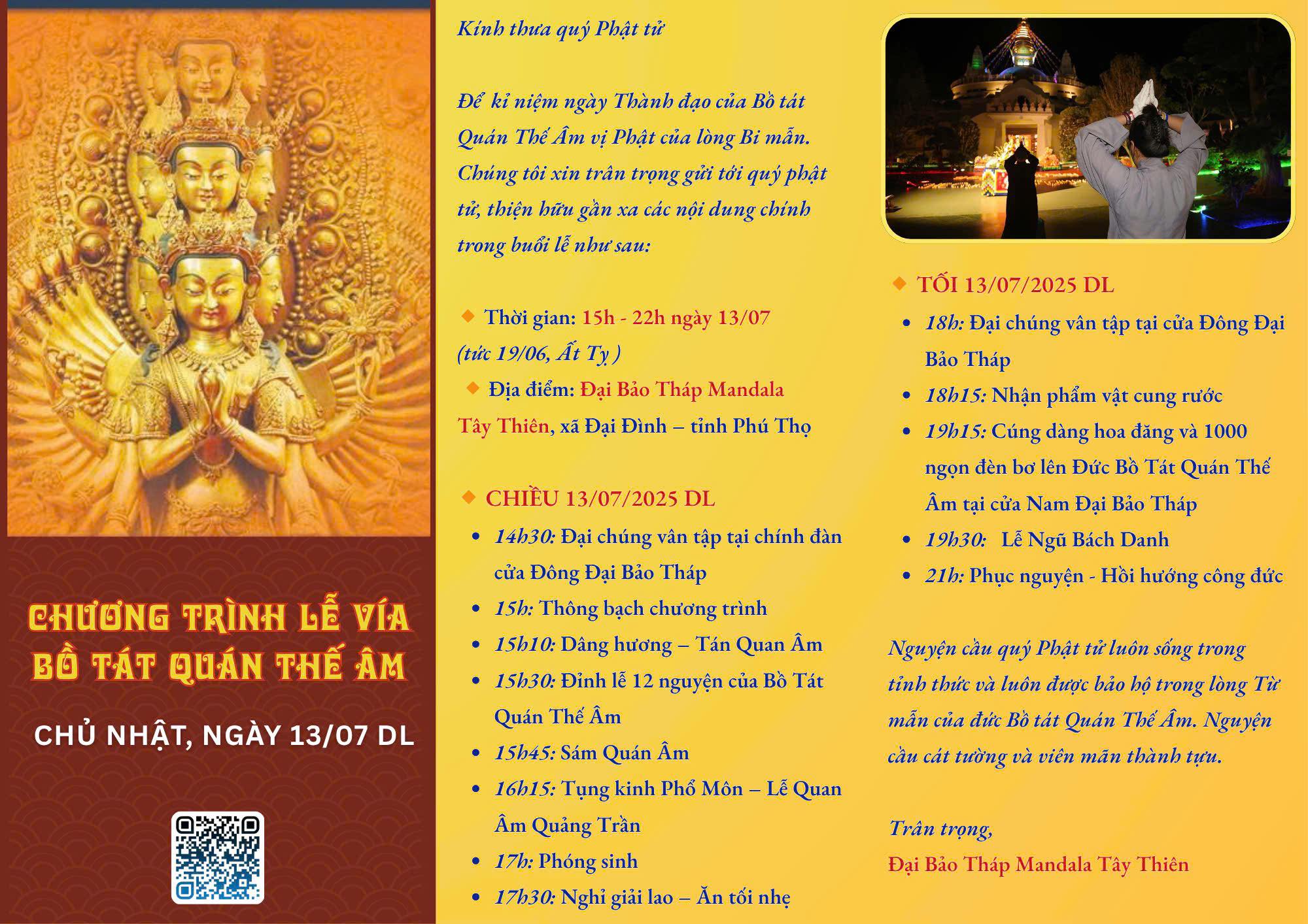 Nhân ngày vía Đức Quán Thế Âm Thành Đạo, Đại Bảo Tháp Mandala Tây Thiên trân trọng kính mời Quý Phật tử cùng vân tập tham gia sự kiện và hướng tâm về hạnh nguyện từ bi của Đức Quán Thế Âm, phát khởi lòng sám hối, tiêu trừ nghiệp chướng và cầu nguyện an lạc cho hết thảy chúng sinh.