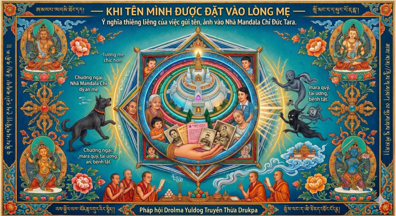 Đây, thưa các bạn, mới là ý nghĩa sâu nhất của việc gửi tên vào Nhà Mandala Chỉ. Không chỉ bảo vệ hiện đời. Không chỉ thanh tẩy nghiệp chướng. Mà là GỬI GẮM CẢ KIẾP SAU VÀO LÒNG MẸ.